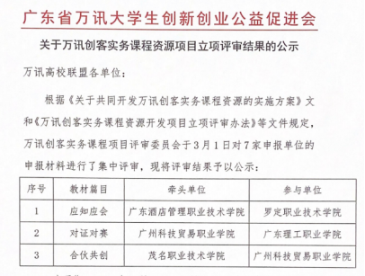 近日,广东省万讯大学生创新创业公益促进会公示了《万讯创客实务课程资源项目立项评审结果》,3家学校获得牵头单位立项,3家学校获得参与学校立项。其中,我校为唯一一所民办高职院校获得立项,我校将作为牵头单位建设《应知应会》模块。此次立项,是我校重视培养学生创新创业能力和创新精神的体现,我校创新创业教育与专业教育有机融合,实训平台与创新创业项目无缝衔接,财税、金融、电商、技术等创业服务体系健全,形成了“创新创业+专业”人才培养模式。