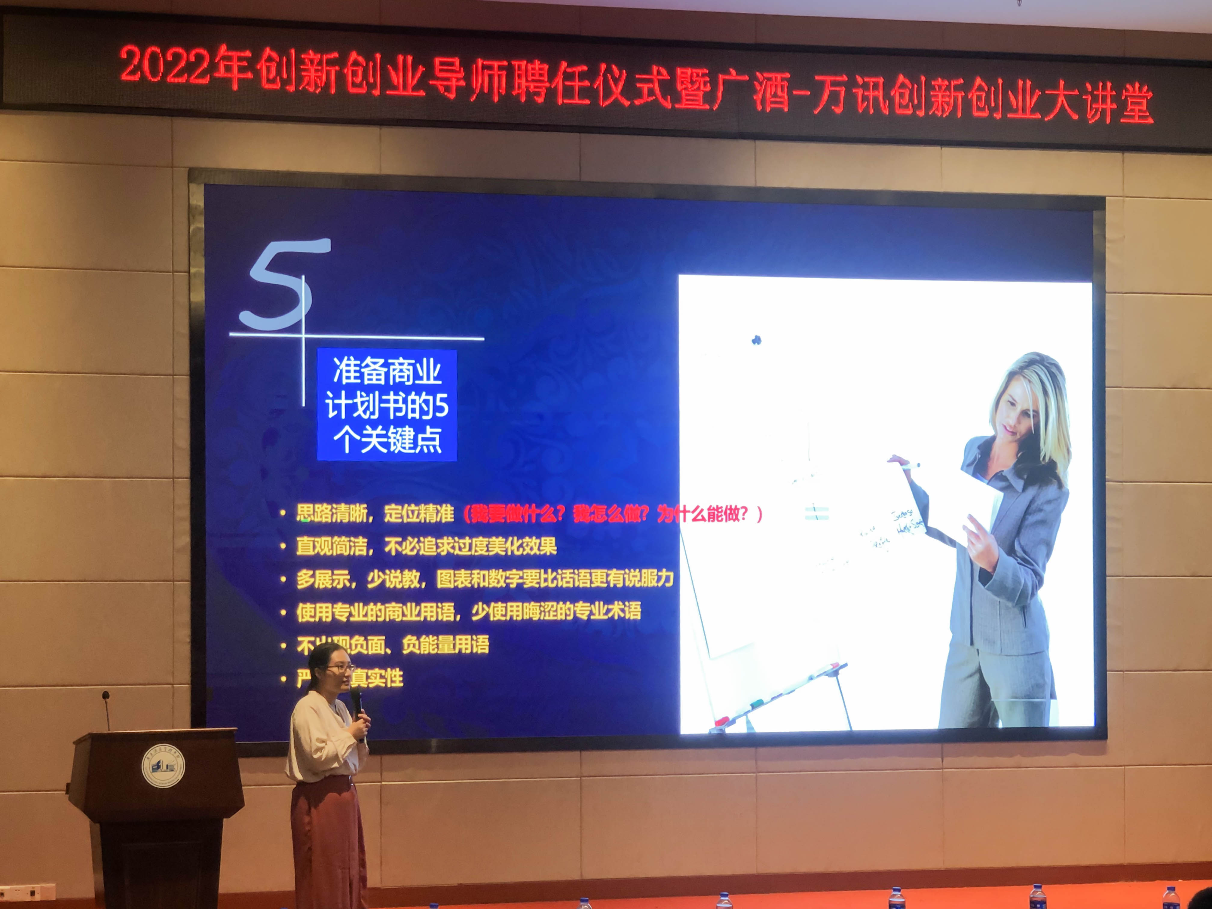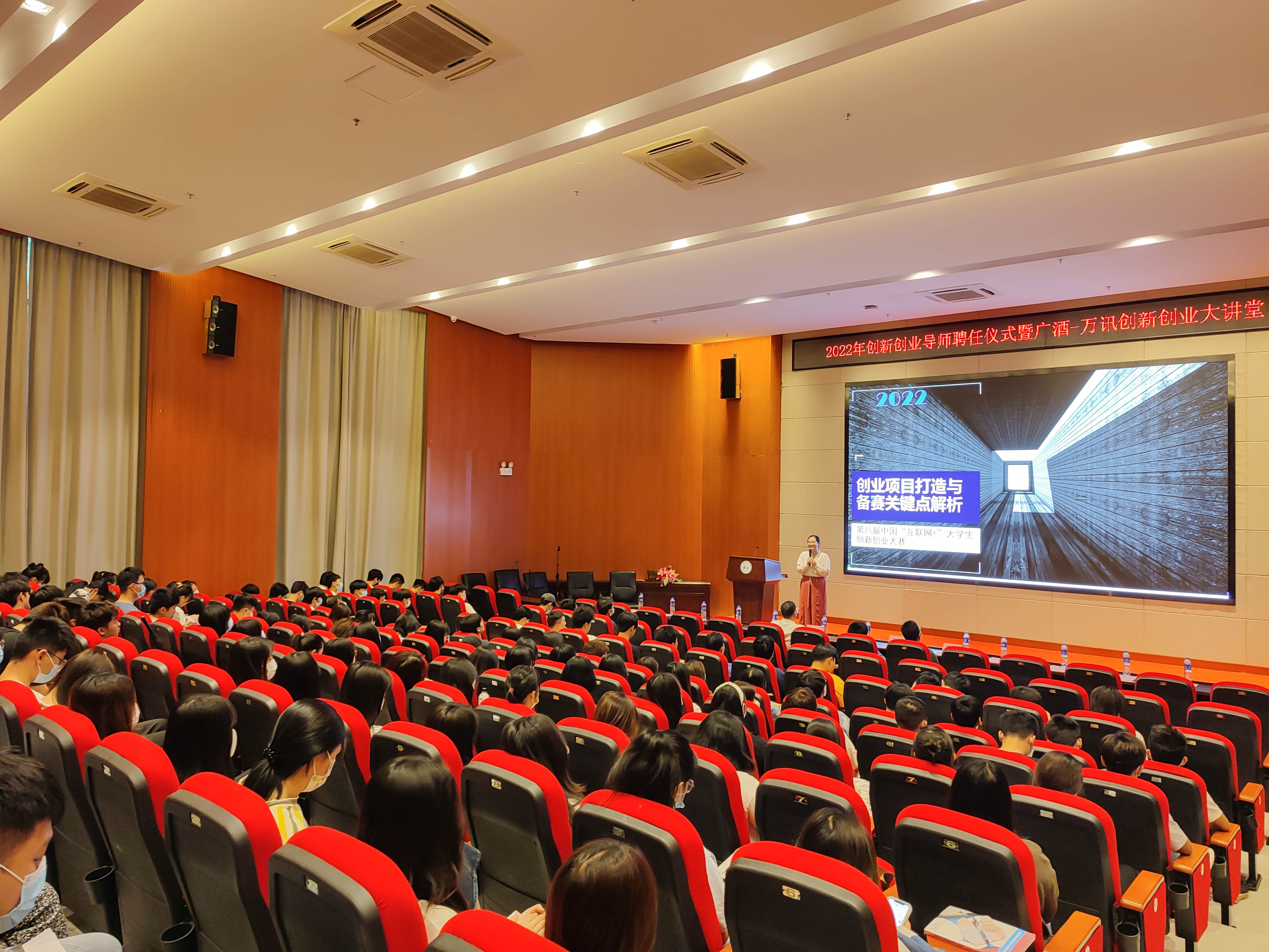 聘任仪式后,劳丹副院长为大家带来了题为《大学生创业项目打造和备赛关键点解析》的讲座,开启了广酒-万讯创新创业大讲堂第二讲的序幕。讲座中,劳丹从创业项目的产生出发,分别对创意、创新、创业三个阶段作了全面阐释,并就不同阶段作出了针对性团队培育指导。同时,她从专业评委角度特别强调商业计划书的“五忌”、“五点”等内容,并就优秀项目的评估标准作了全方位解读。现场师生边听边记,受益匪浅。